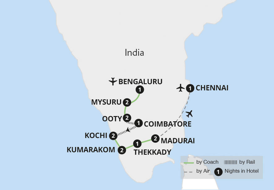 This unforgettable tour of colourful southern India explores exciting cities, stunning Hindu temples, atmospheric mountain plantations and tranquil backwaters. After a night in Bengaluru, we soak up Mysuru's awe-inspiring royal palace and the charms of botanic Ooty before the tea plantations of Coonoor on the Nilgiri Mountain Railway. Arriving...