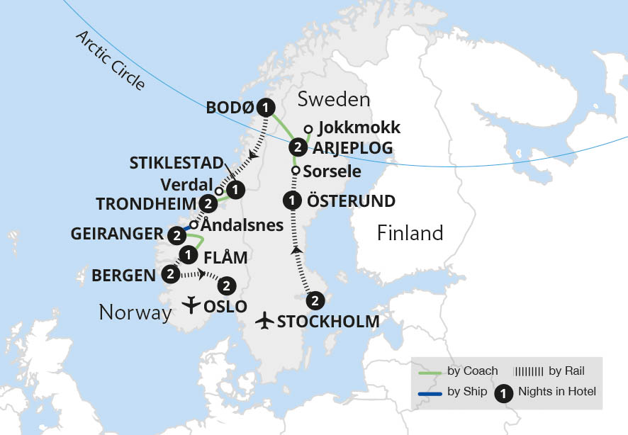 • Explore iconic cities like Stockholm, Trondheim, Bergen, and Oslo on guided tours