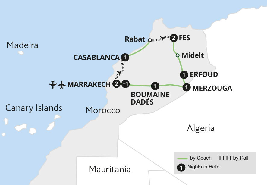 On a journey through Morocco, discover the rich heritage of its imperial cities and the timeless beauty of the Atlas Mountains and Sahara Desert. Explore the historic streets of Fes, Marrakech and Rabat, where bustling souks, intricate palaces and grand mosques offer a window into Morocco's past and present. Venture into the High Atlas, visit...