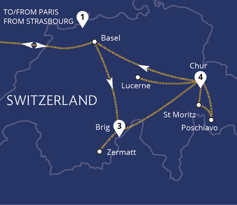 Undoubtedly Switzerland's best-known train, the Glacier Express winds its way through some of Europe's most dramatic and beautiful scenery. Called 'the slowest express train in the world', the panoramic carriages allow us to soak up the spectacular views as we traverse incredible mountain passes, picturesque villages and valleys between the popular alpine resorts of St Moritz and Zermatt. Enroute, the train clings to the mountainsides on the Albula Line, zigzags and spirals its way round mountains and over bridges, and delves into the Rhine Valley - also known as the 'Swiss Grand Canyon'.